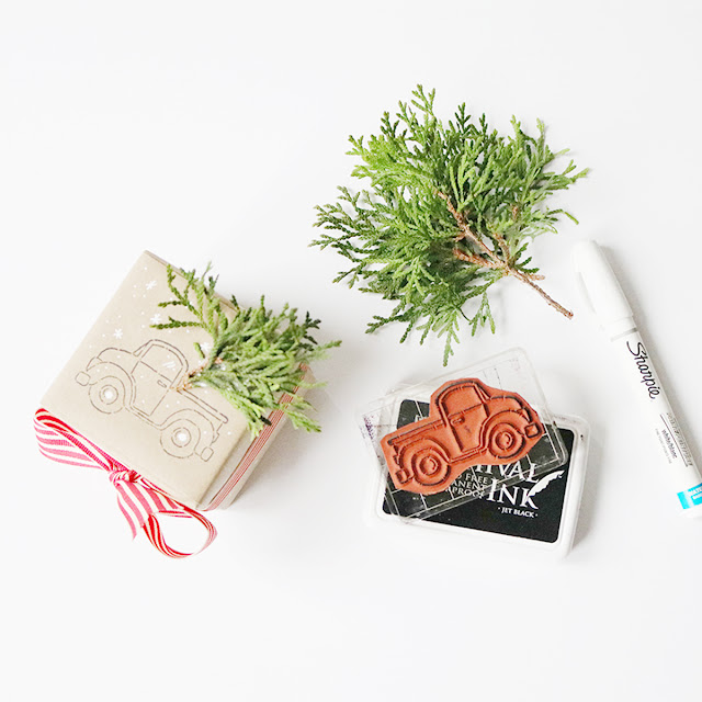The same technique with the stamped image was used on this gift bag but this time the small pieces of fresh cedar were added to the bag a little differently. A small slit was made into the bag so that the cedar could be inserted into the "trunk" of the truck. A few pieces of two-sided of tape were used to keep the cedar in place.